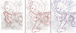 色々といぢってみましたが、ワタクシ的には下半身の見せ方に難がある感じがしました (いや、難……と言いますか、せっかくの“迫力のある武器パース・デフォルメ”をスポイルしている様な感じがしました)。